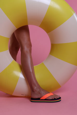 Redécouvrez la tong arc-en-ciel iconique des années 80, celle qui a marqué nos étés au bord de mer dans les 80s/90s.
